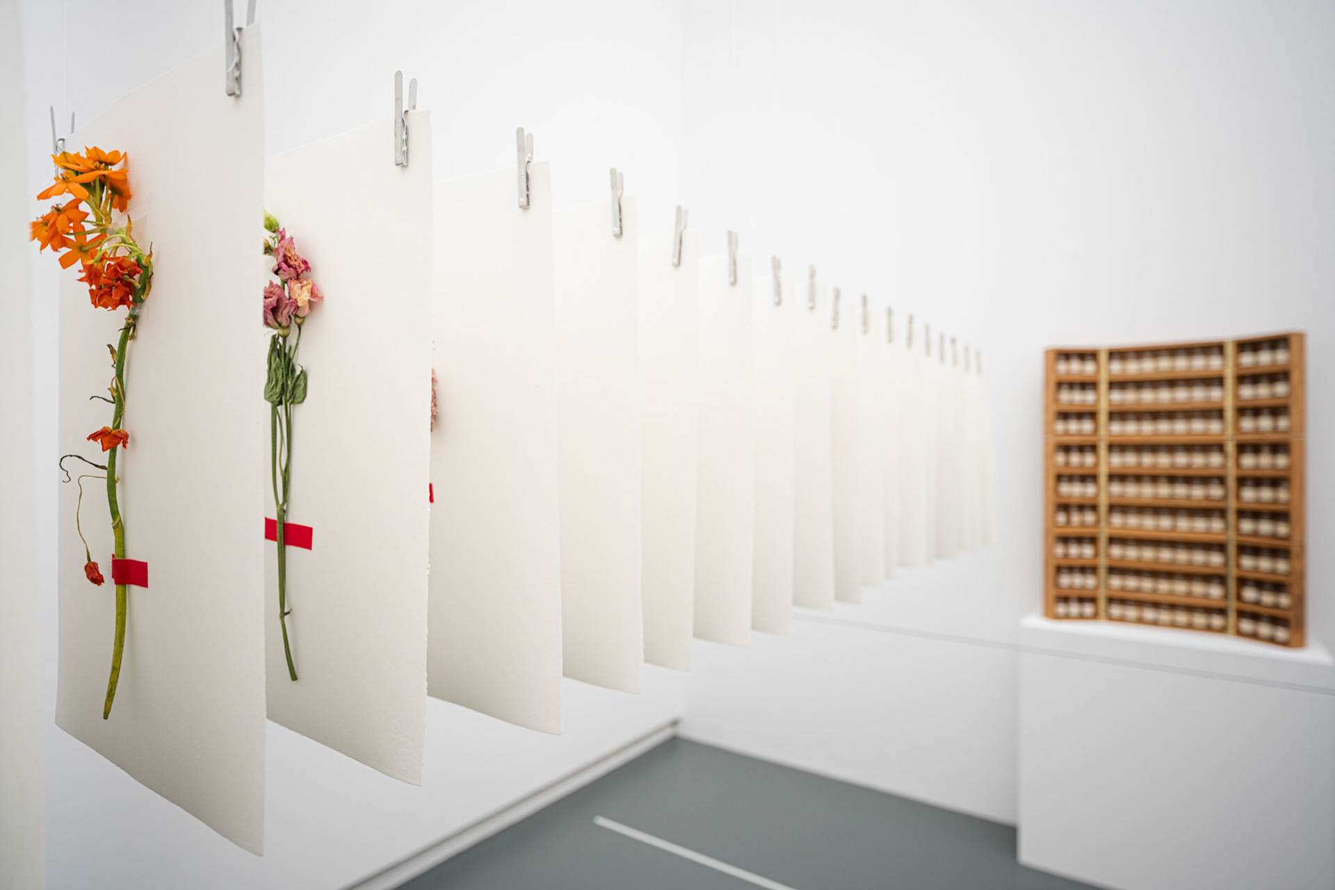 Daniel Spoerri’s La Pharmacie Bretonne (1981) is a collection of 117 water samples gathered during his journey through Brittany to document healing springs. Inspired by Spoerri’s approach, florist Manuela Boucher used flowers previously displayed in medical offices and banks. Arranged on handmade paper where water plays a key role in its production, her display also echoes the movement of water.