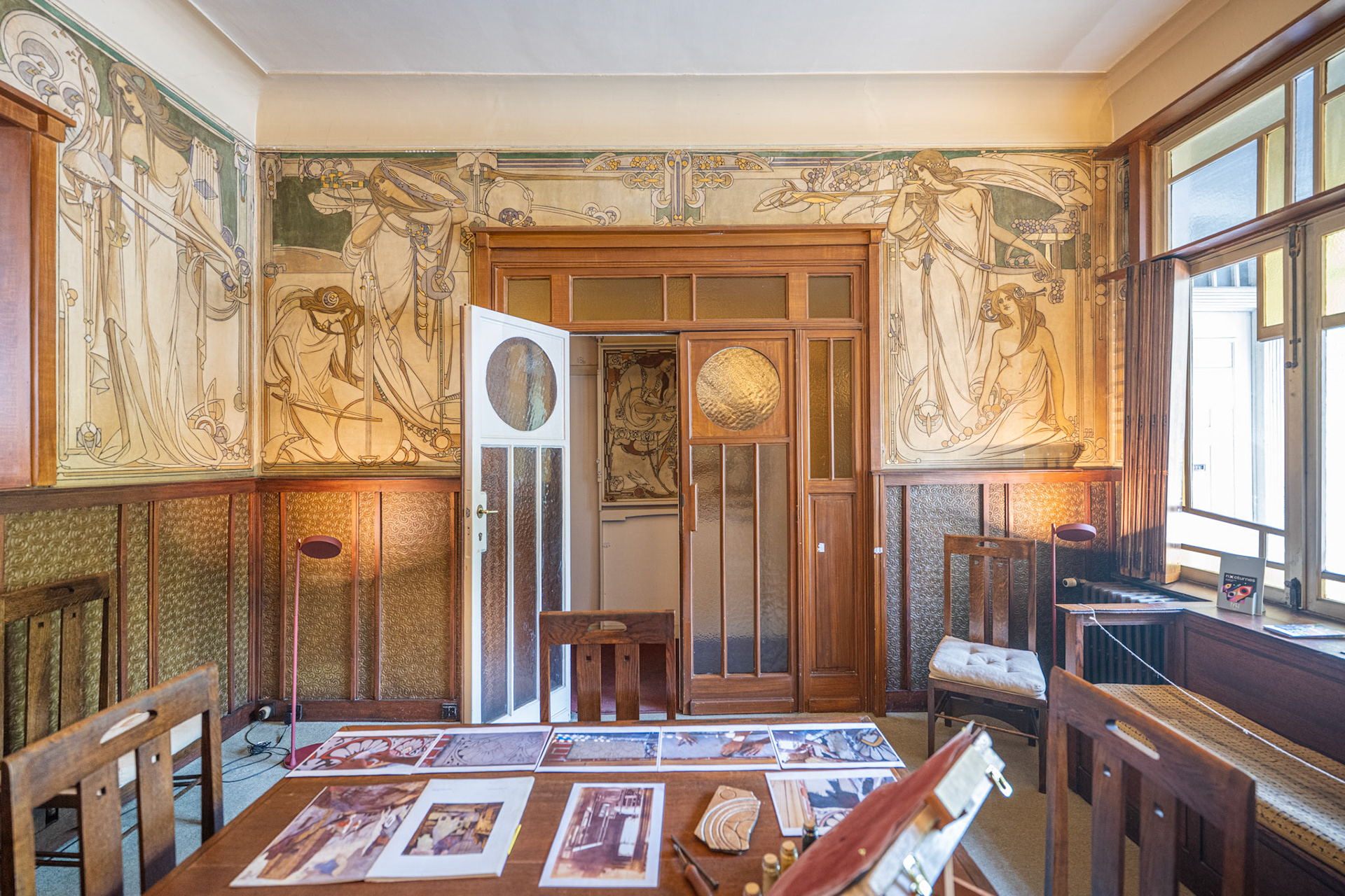 The ground floor contains the former office which again showcased their work. Its sgraffito decoration, a rare technique for interiors, features an iconography representing the five senses.
