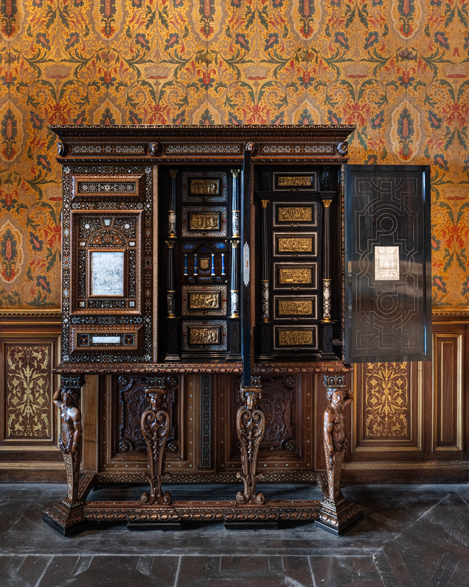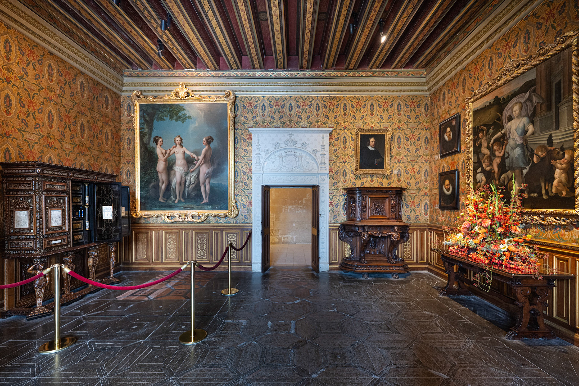 The Diane de Poitiers Chamber is dominated by a monumental stone fireplace, the work of sculptor Jean Goujon. Above the fireplace, a portrait of Catherine de Médicis, painted by Henri Sauvage in 1901, is prominently displayed. The Queen is depicted in an austere black gown and coif, the perpetual mourning attire she adopted after the death of her husband, Henri II.