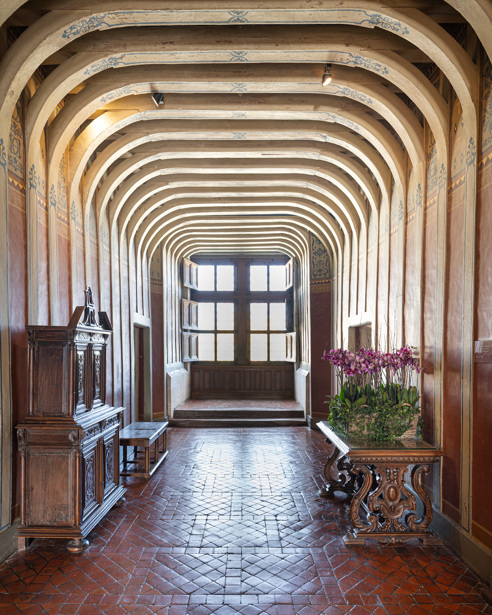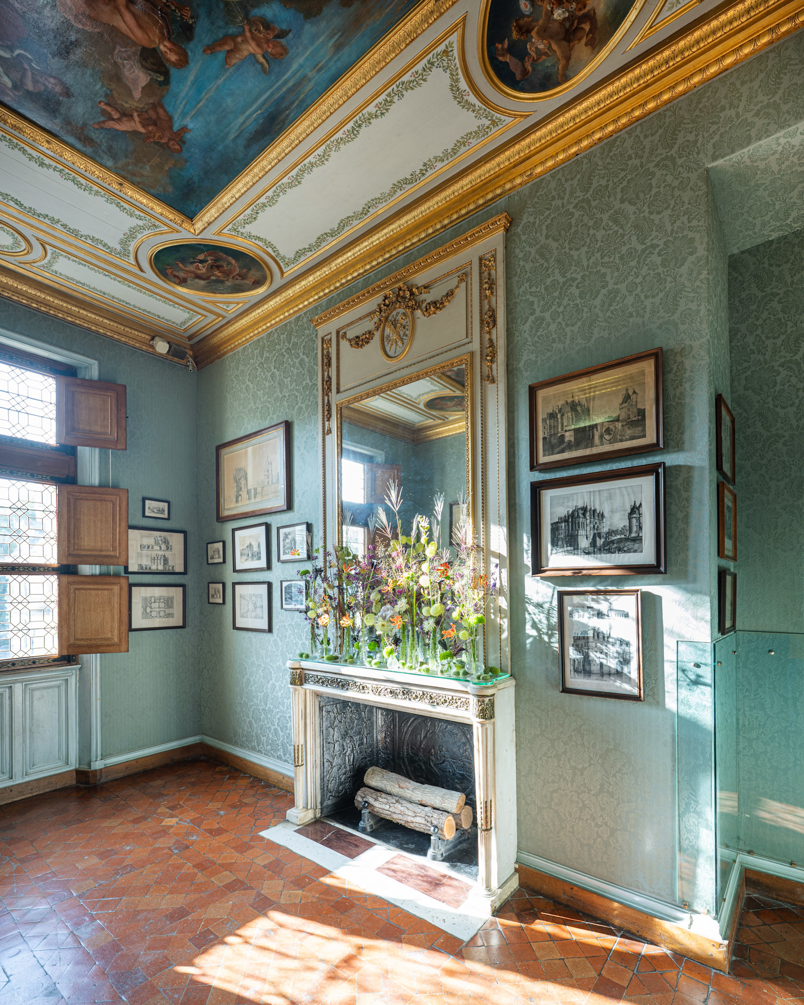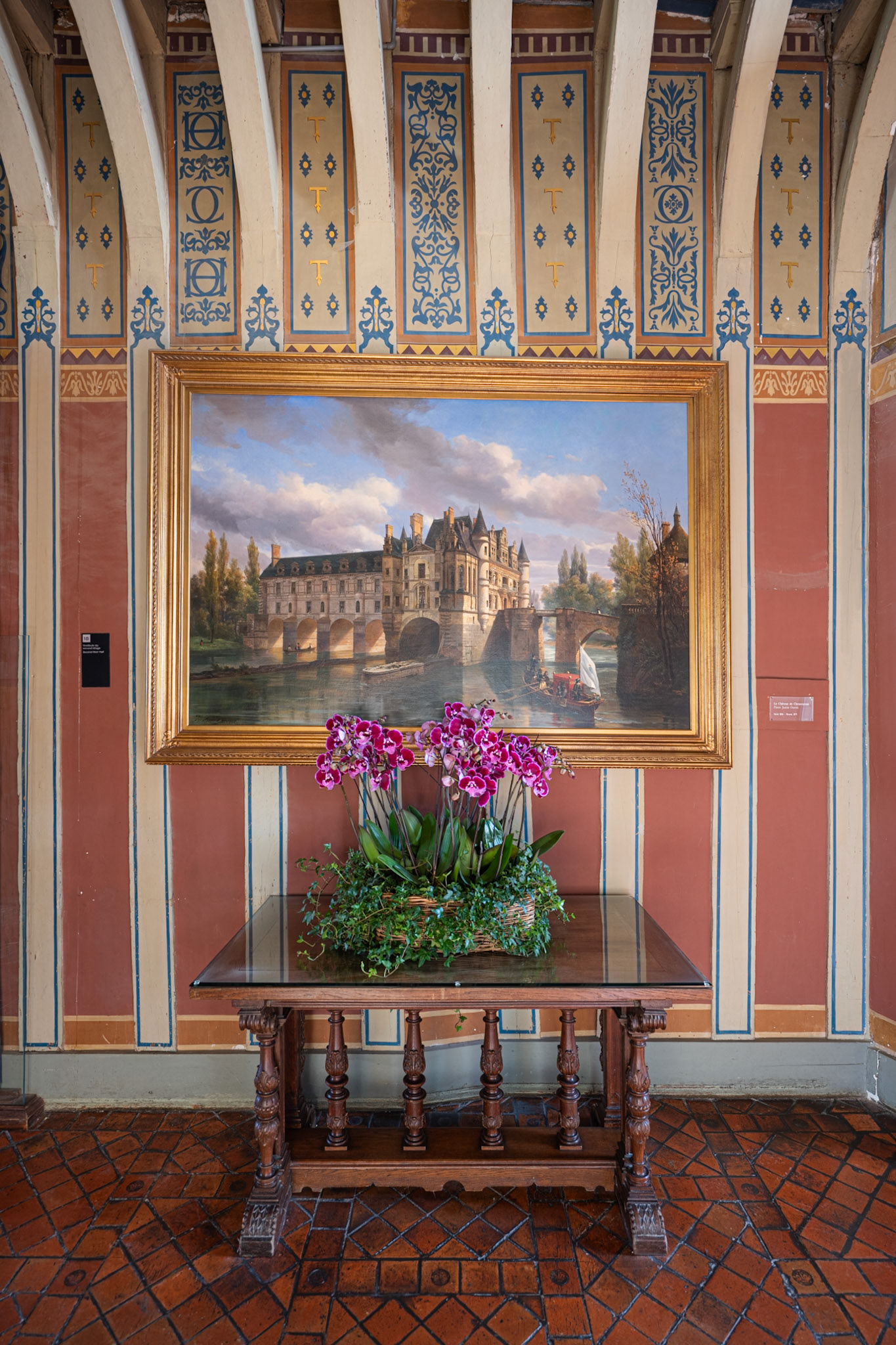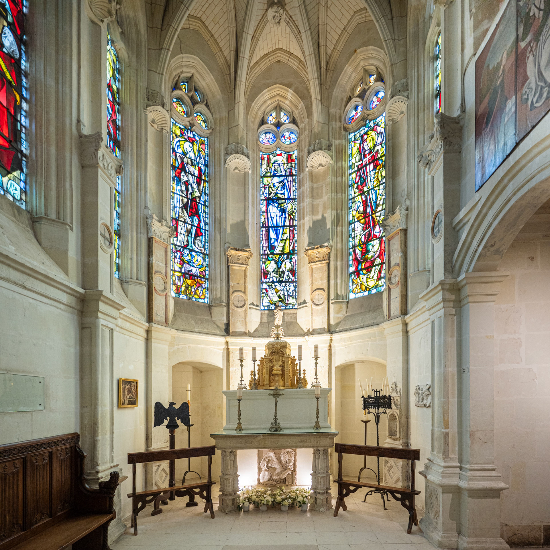 The chapel of Château de Chenonceau was preserved during the French Revolution thanks to Madame Dupin, the owner of the time, who concealed its religious function by using it as a wood store. The original stained glass windows were destroyed during a 1944 bombing and replaced in 1954 by new creations from master glassmaker Max Ingrand.