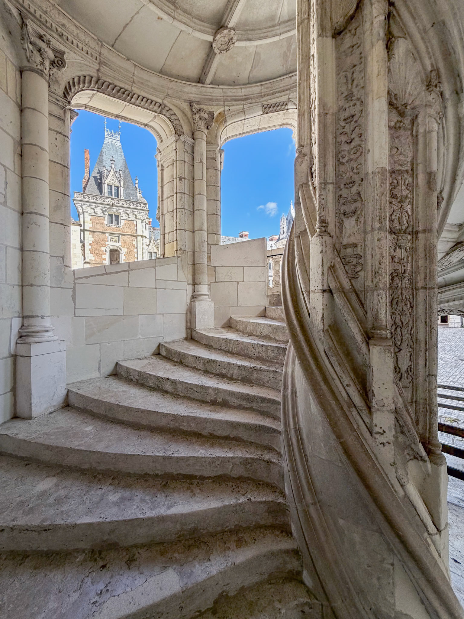 The François Ier Wing introduces full Renaissance architecture to the château. Built in the early 16th century, it is best known for its monumental external staircase whose openwork structure and richly detailed reliefs exemplify the new vocabulary brought from Italy. Its façades combine classical motifs and symbolic emblems of François Ier, including the salamander, which appears throughout the decorative program.