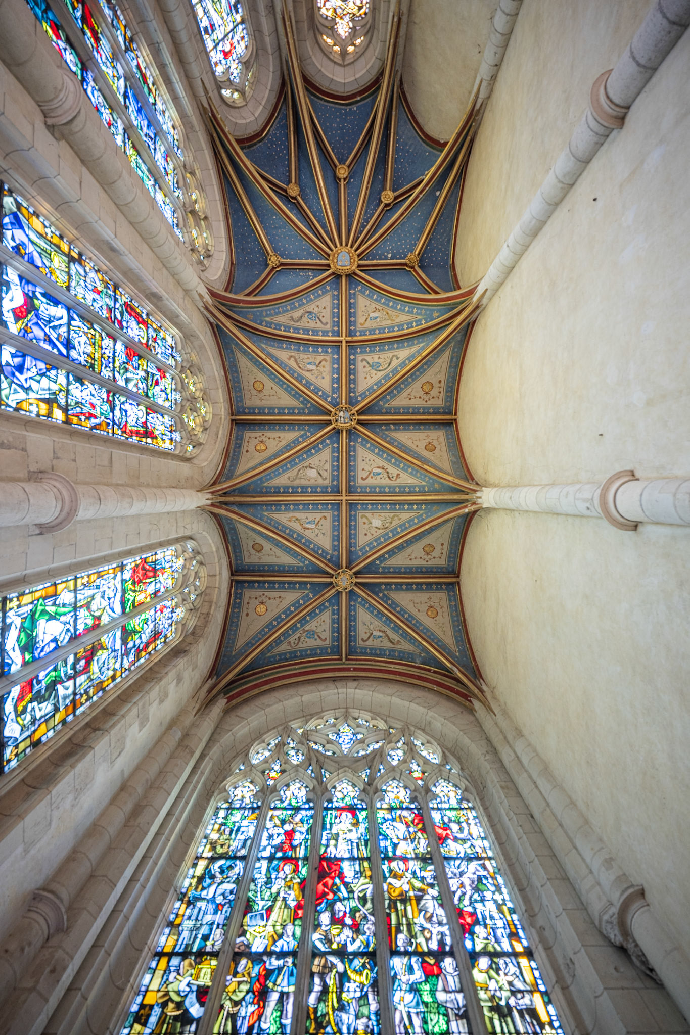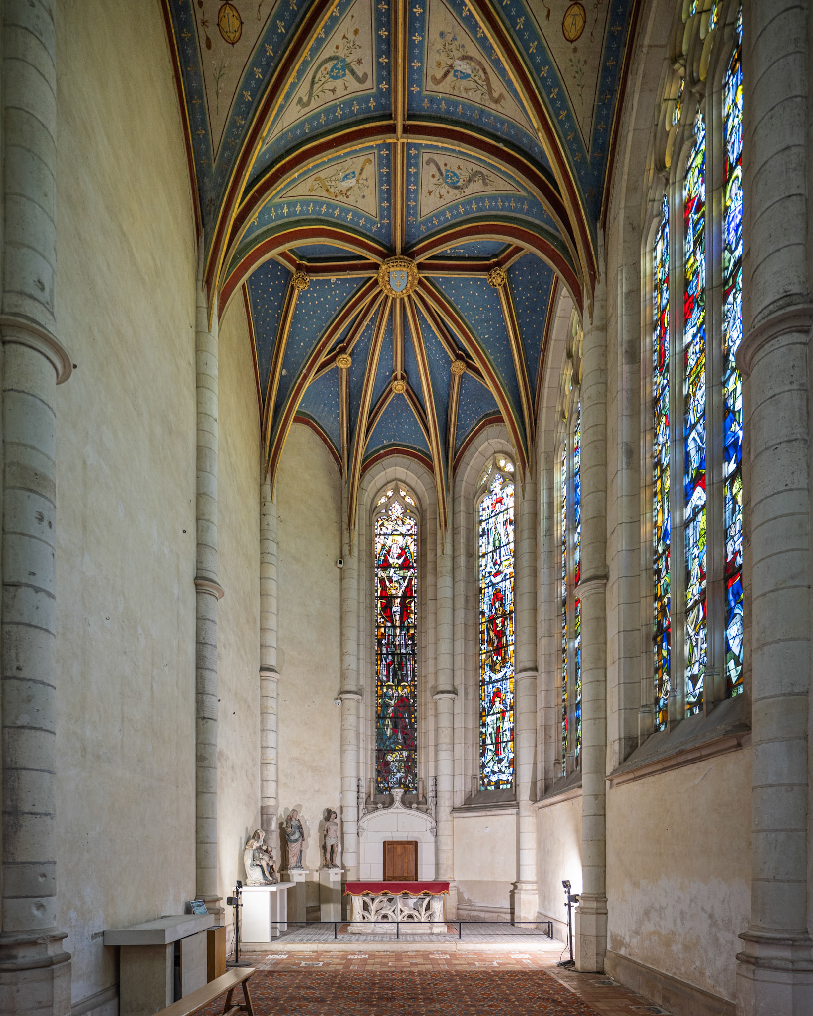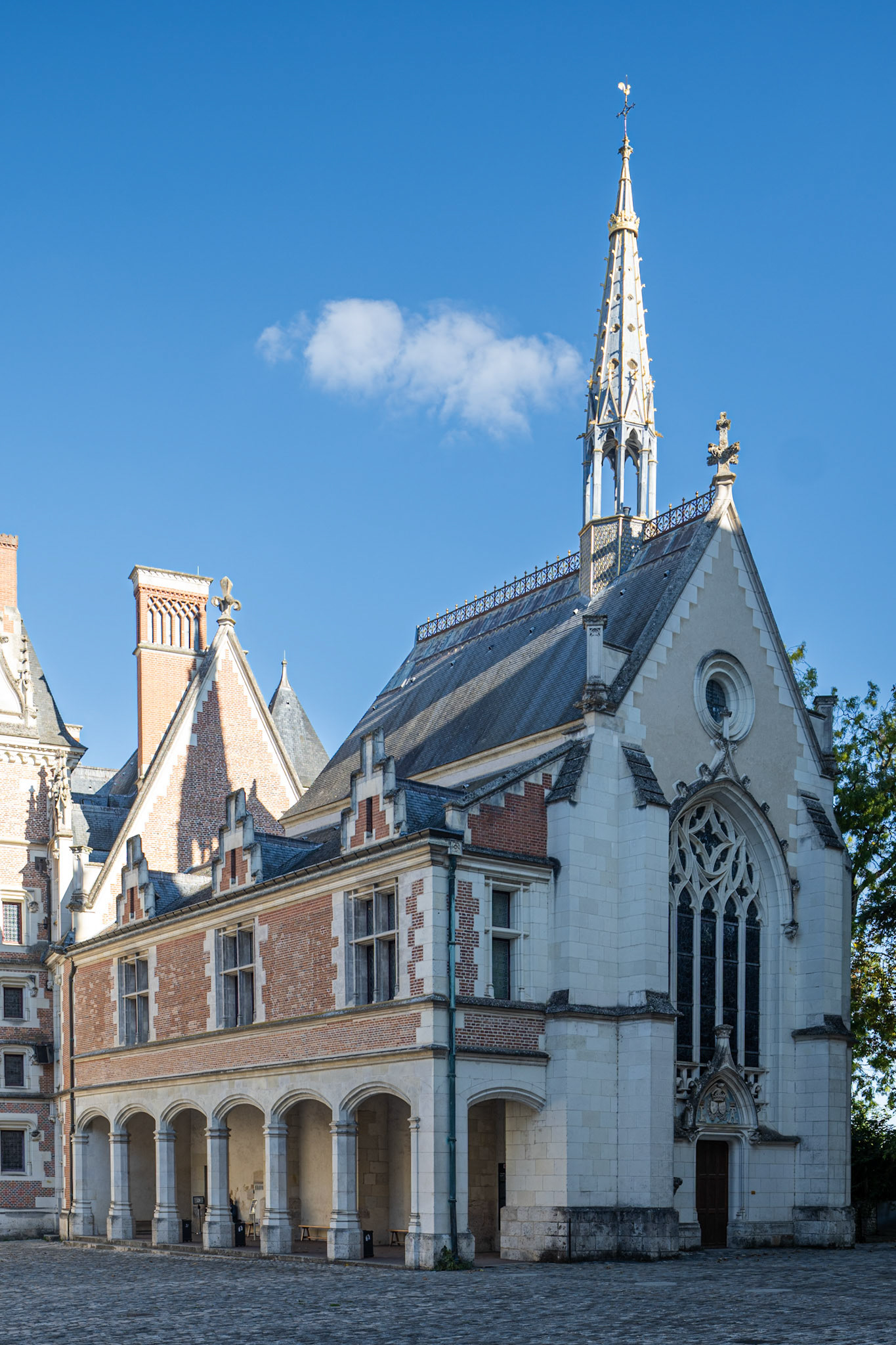 The Chapel of Saint-Calais at the Château de Blois is the oldest structure within the castle complex. Originally founded by Count Thibaut III of Blois in 854, it was reconstructed in the late 15th century under Louis XII in the Flamboyant Gothic style. Dedicated to Saint Calais, bishop of Anjou, the chapel stands apart from the main courtyard. Of the 16th-century chapel, only the Gothic choir with its lierne-and-tierceron vaults remains, as the nave was demolished in 1635 by Mansart during the construction of the Gaston d’Orléans wing, reducing the chapel’s original length by about half. The current façade, designed by Félix Duban and Jules de La Morandière, dates from 1870. Damaged during the Second World War, the chapel lost its stained-glass windows, which were replaced in 1957 by Max Ingrand with modern panels depicting figures from local history, including Joan of Arc and Charles of Blois.