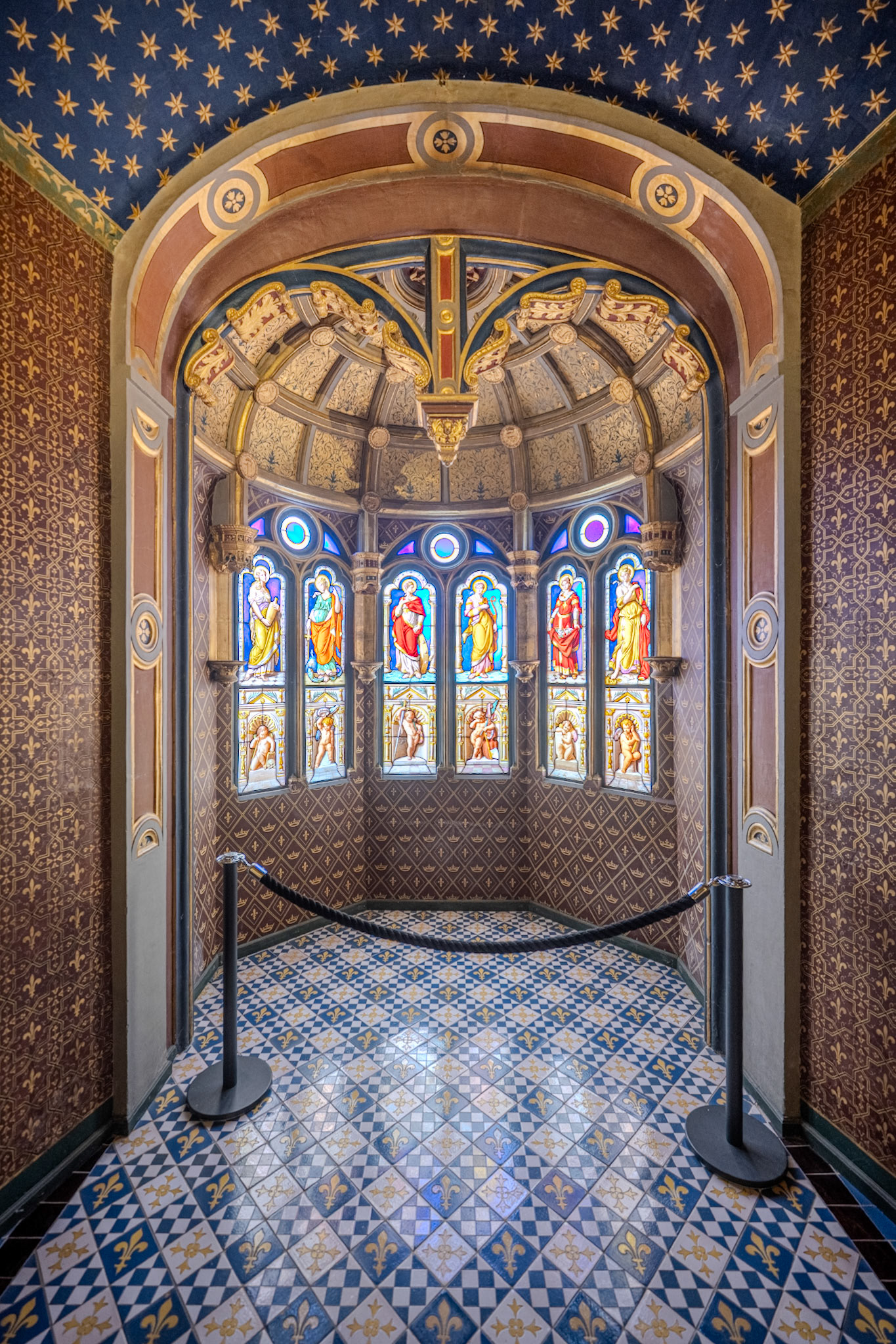 The Chapel of Saint-Calais is the oldest structure within the castle complex. Originally founded by Count Thibaut III of Blois in 854, it was reconstructed in the late 15th century under Louis XII in the Flamboyant Gothic style. Dedicated to Saint Calais, bishop of Anjou, the chapel stands apart from the main courtyard. Of the 16th-century chapel, only the Gothic choir with its lierne-and-tierceron vaults remains, as the nave was demolished in 1635 by Mansart during the construction of the Gaston d’Orléans wing, reducing the chapel’s original length by about half. The current façade, designed by Félix Duban and Jules de La Morandière, dates from 1870. Damaged during the Second World War, the chapel lost its stained-glass windows, which were replaced in 1957 by Max Ingrand with modern panels depicting figures from local history, including Joan of Arc and Charles of Blois.
